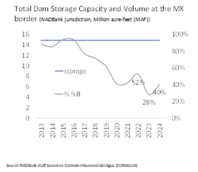We estimate that total reservoir storage capacity along the Mexican border is 14.8 million acre-feet (MAF) (18,302 million cubic meters (mm3), or roughly half the storage capacity of Lake Mead (Hoover Dam). Many of these smaller dams are essential for agriculture along the Mexico border and serve as sources of water for deliveries that support agriculture in the U.S. Surface water in Mexico is not only currently limited but has declined rapidly over the last few years, as shown below.