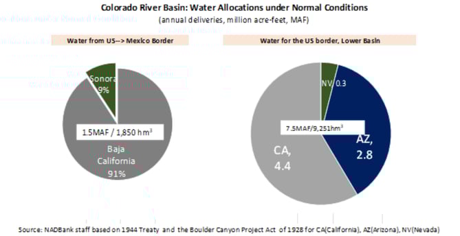 In Mexico, agriculture has been facilitated by water deliveries from the U.S. that fulfil international water agreements, which, under normal conditions, provide 1.5 million acre-feet of water annually (see below). However, Lake Mead is under stress and has triggered a series of water cuts, directly affecting agriculture along the border.