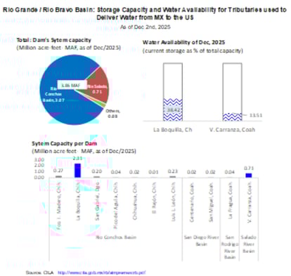 The reservoir storage capacity on the Mexican side that contributes to water deliveries for the Rio Grande is limited to an estimated 3.86 million acre-feet (4,775mm3), with 60% of that storage capacity available at La Boquilla Dam (Conchos River, Chihuahua) and 18% at Carranza Dam (Salado River, Coahuila). These two major reservoirs are currently under stress, operating below 38% capacity, and are among the most important sources supporting Mexico's water deliveries to the U.S.
